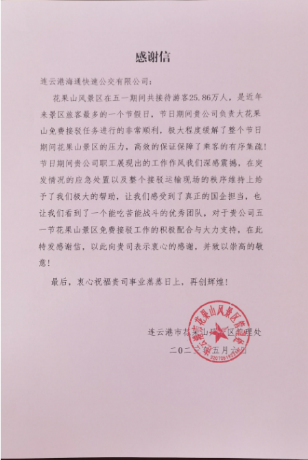 近日,花果山景区向市交通控股时博app最新版下载,时博(中国)权属公交时博app最新版下载,时博(中国)送来了一封感谢信,感谢公交时博app最新版下载,时博(中国)在五一期间高效的保障了游客的有序疏散。