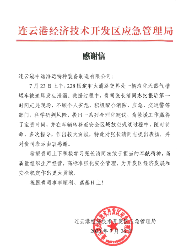 近日,市开发区应急管理局代表到市交通控股时博app最新版下载,时博(中国)权属物流时博app最新版下载,时博(中国)合资的中远海运特种装备制造有限公司,将一封感谢信送交公司副总经理张长清手中,感谢张长清积极配合消防、应急、交巡警等部门处理228国道和大浦路交界处发生的液化天然气槽罐车被追尾泄露事故。号召公司上下积极学习张长清敢于担当的奉献精神,高质量组织生产经营,高标准强化安全管理,为市开发区经济发展和安全稳定作出更大贡献。