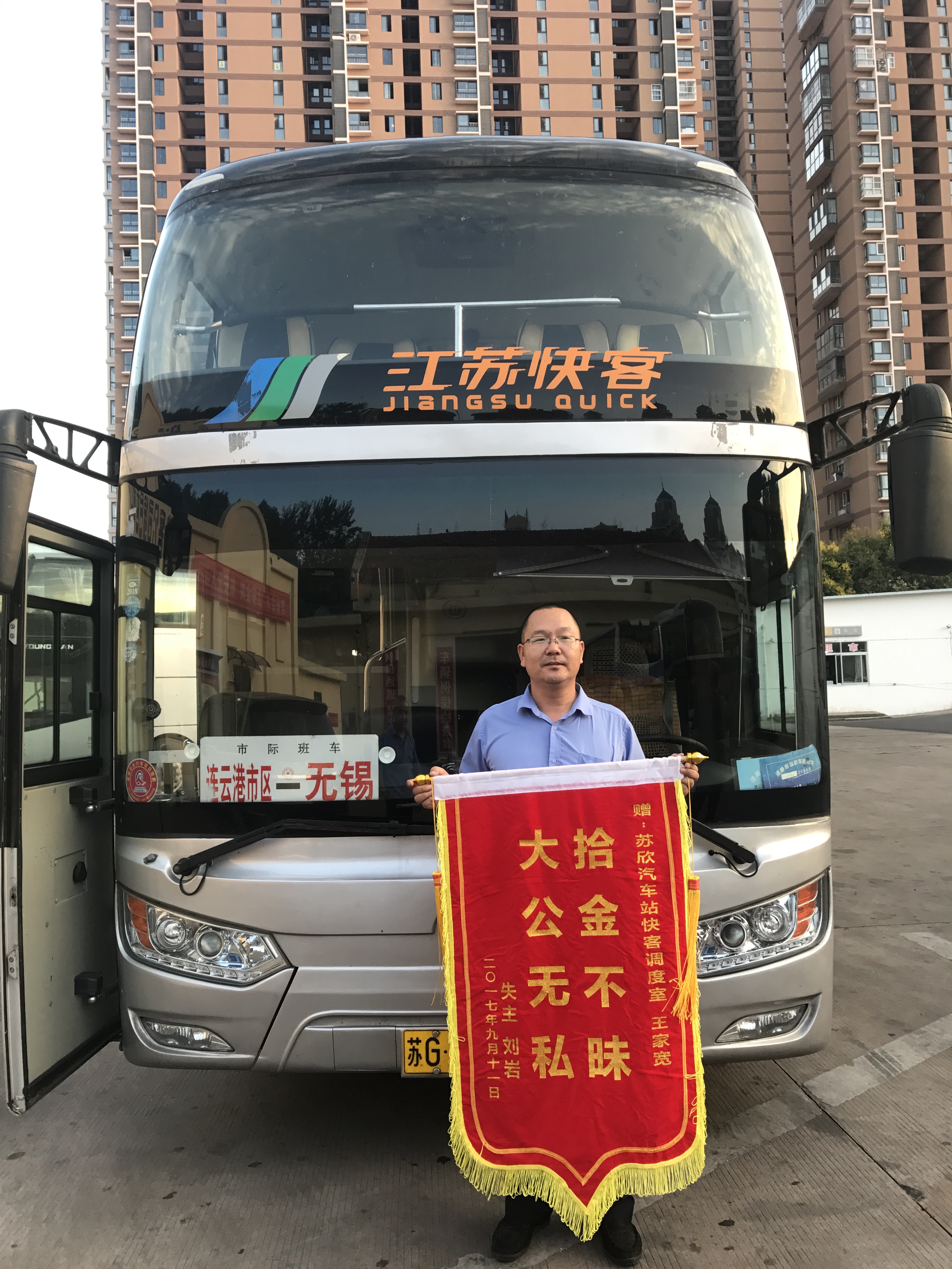 9月11日下午5点多,快客公司驾驶员王家宽驾驶的苏GA0916客车到达无锡站后,等送走所有旅客,他便打扫起车厢内卫生。在车辆的座位下发现一个钱包,里面有现金三千余元、身份证、银行卡等,可是没有电话信息,他猜想一定是乘客丢在车上的,失主肯定很着急,估计只要发现就能马上过来,于是他便在车边等候。与此同时,失主刘同学心急如焚,他是今年从无锡大学考上军校的学生,因为要到无锡学校去办手续,而且当天就要从无锡到沈阳去,钱包丢了不仅没钱,关键是没有身份证就不能买票,就会耽搁报到时间。他心急如焚,抱着一线希望他通过车票信息,联系了快客公司运调中心,快客公司迅速与王家宽联系,王家宽告诉公司就在车边等着失主,公司告诉了刘同学,刘同学迅速赶回了汽车站,找到王家宽,当从王师傅手中拿回自己的钱包时,无比激动,握着王师傅的手,感动的说:“谢谢王师傅,你是活雷锋啊”。事后,他让他的父母到快客公司送去锦旗,让公司领导知道王师傅做的好事。