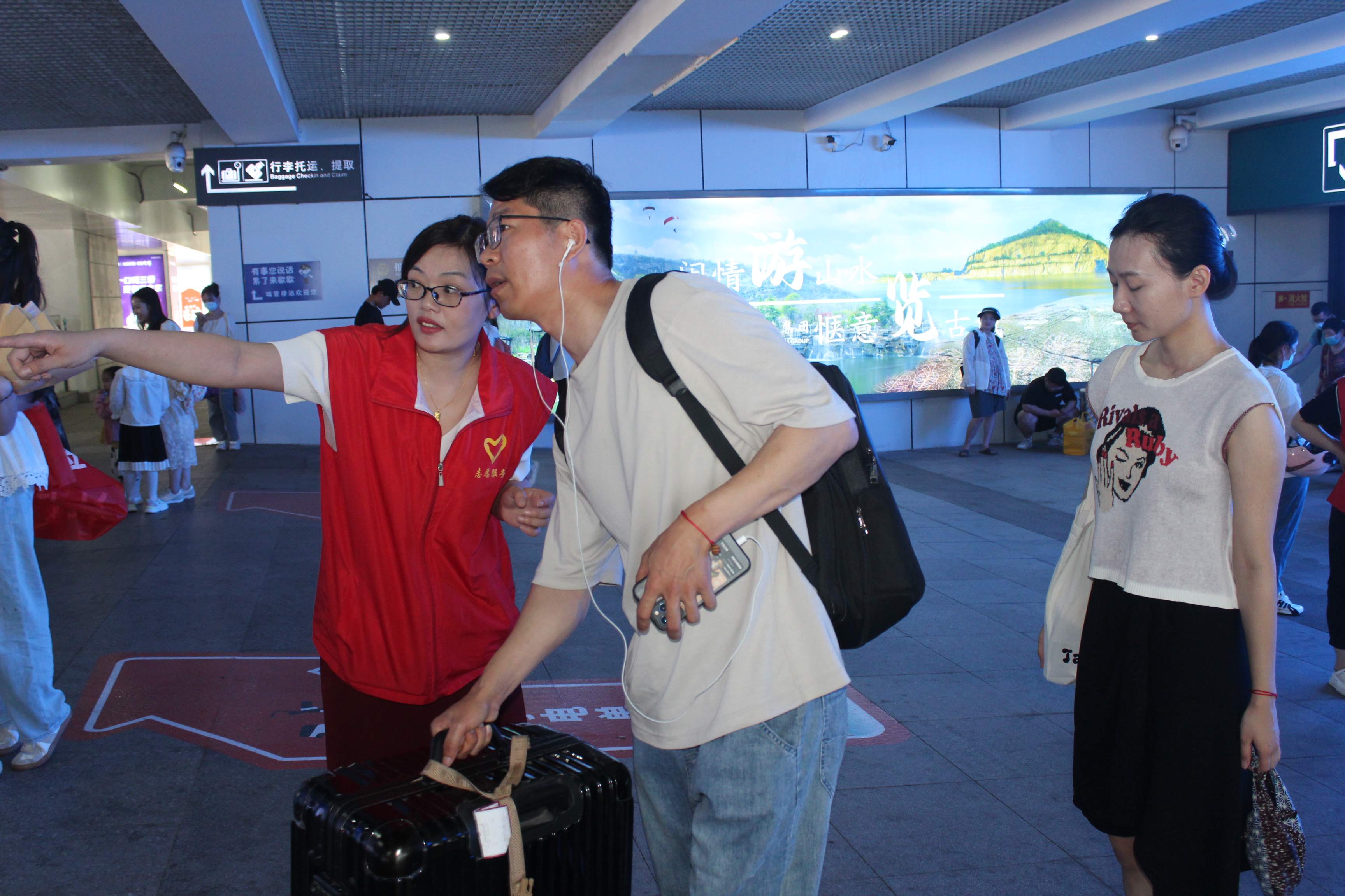 旅客王女士一家3人携带大大小小一共7件行李,他们刚走出出站口,志愿者于丽婕立马过来帮她“减负”了。王女士开心的说:“每年我回来的时候,在“雷锋车”驿站都有志愿者很热情地帮忙,给我提行李,热情帮助我,使我轻松了许多。”