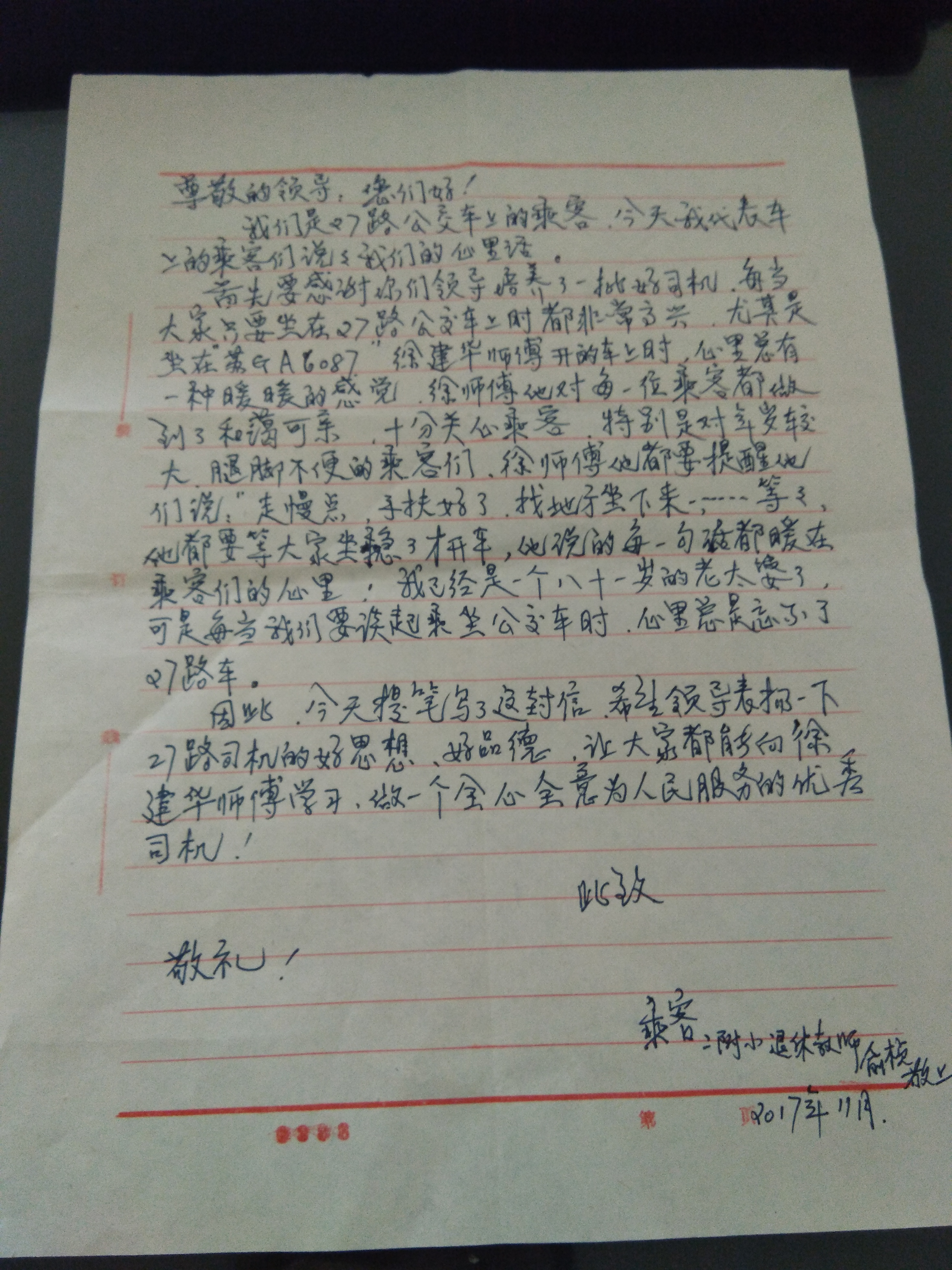 俞老师是连云港市一附小的退休老师,耄耋之年的她在感谢信中写道:“27路徐师傅对每一位乘客都做到了和蔼可亲,十分关心乘客,特别是对年岁较大、腿脚不便的乘客们,徐师傅他都要提醒他们,走慢点,手扶好了,找地方坐下来……”、“他说的每一句话都暖在乘客们的心里。”、“我已经是一个八十一岁的老太婆了,每当我们要谈起乘坐公交车时,心里总是忘不了27路车。”这些句子,字里行间表达了俞老师对公交27路驾驶员徐健伟真情服务的高度赞扬。