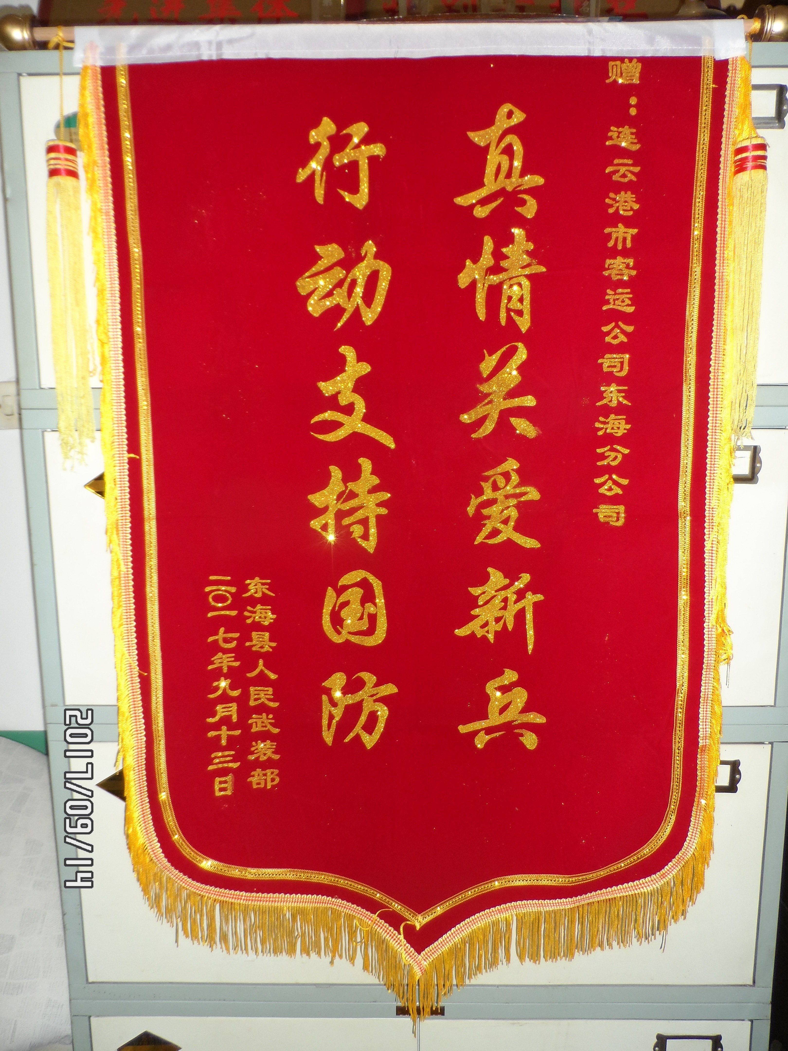 今年的新兵运输工作主要集中在9月10日、12日、13日。作为东海县新兵运输的唯一承运单位,东海公司提前做好了精细筹划和充分准备。在运输过程中,东海公司严格落实安全、服务两手抓,圆满完成了本次运兵任务,受到了东海县武装部和社会各界的一致好评,并获赠“真情关爱新兵 行动支持国防”锦旗。