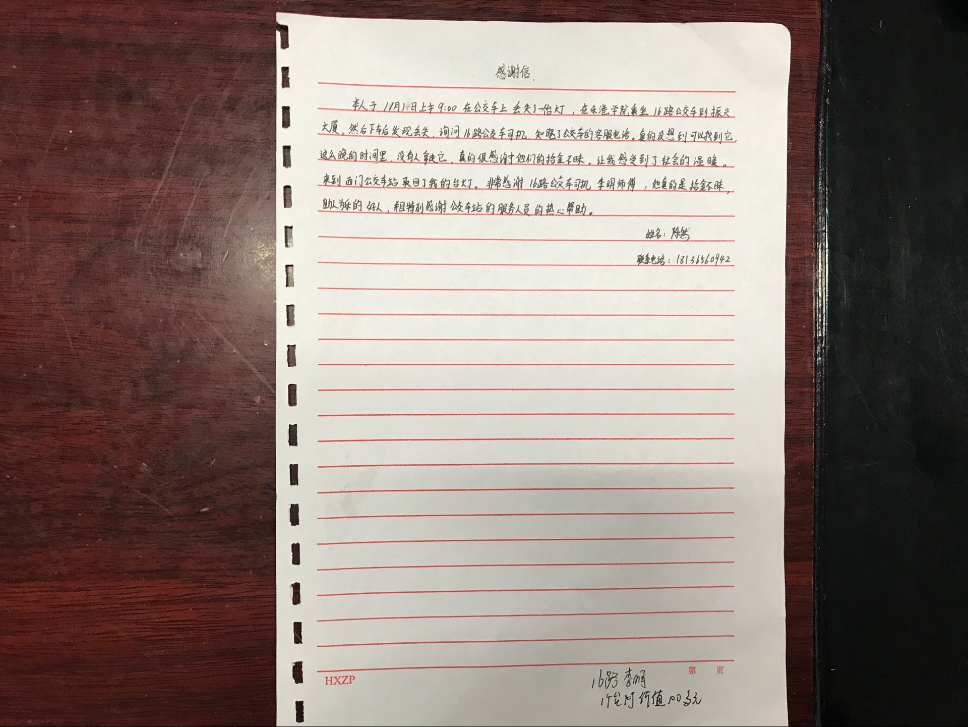 陈同学当场写下了一封感谢信,感谢公交16路驾驶员李明师傅拾金不昧、助人为乐,感谢西门车站的工作人员细心保管自己的台灯,感谢公交人的热心帮助。