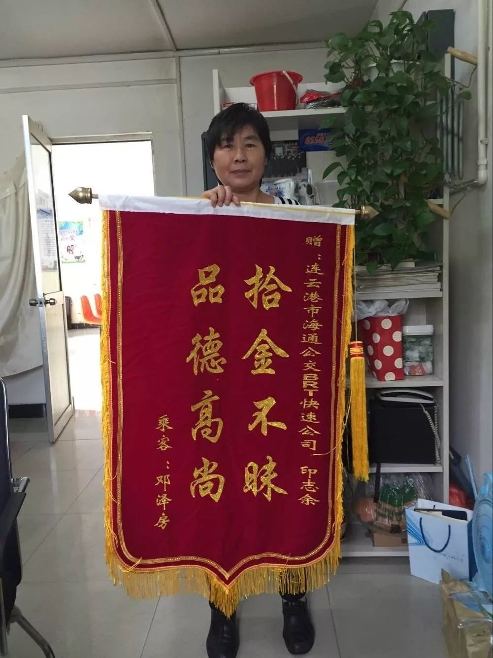 随后不久,邓女士专程送来一面印有“拾金不昧 品德高尚”字样的锦旗交于海州站调度手中,对驾驶员印师傅表示感谢。
