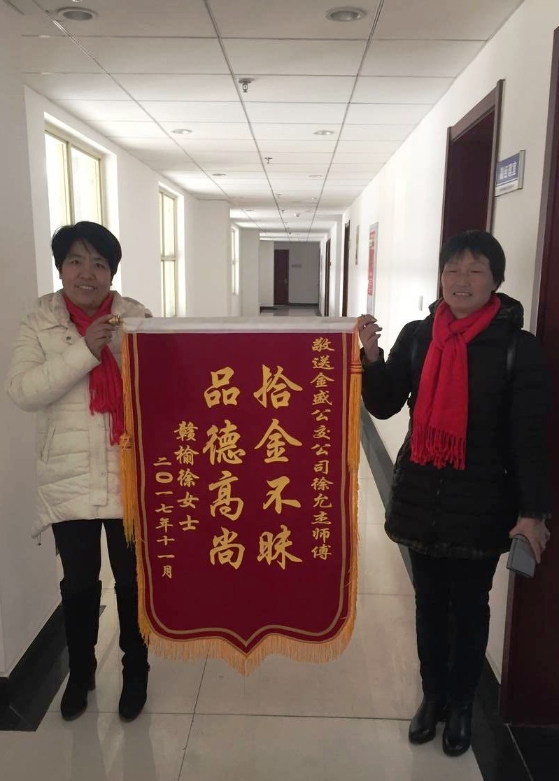 11月28日,徐女士乘坐金盛公交公司的602路公交车从赣榆区至连云港市区,车辆到达罗阳站时随手将装有身份证、银行卡、数百元现金等物品的钱包放在旁边座位上,等到了市区终点站下车以后才发现钱包落在了车里,这可急坏了徐女士,抱着一线希望拨打了金盛公交公司的电话,没想到驾驶员徐师傅已经将拾到钱包的情况上报给公司。惊喜之余的徐女士被徐师傅这种拾金不昧的高尚品德所感动,回到赣榆区后立即制作了“拾金不昧,品德高尚”的八字锦旗送到金盛公交公司,拿到失而复得的钱包后,徐女士非常激动地表示“多亏了拾金不昧的徐师傅,不仅避免了经济损失,而且避免了补办卡证带来的很多麻烦,从报失到找到钱包,前后不到十五分钟,非常感谢工作人员的热情帮助和驾驶员的拾金不昧,为你们点赞!”
